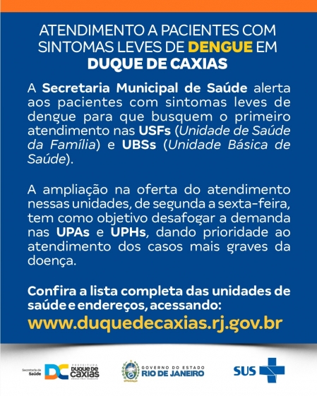A Prefeitura de Duque de Caxias, através da Secretaria Municipal de Saúde, recomenda aos pacientes com sintomas leves de dengue no município que busquem o primeiro atendimento nas 50 Unidades de Saúde da Família (USFs) e Unidades Básicas de Saúde (UBSs) espalhadas nos quatro distritos. .