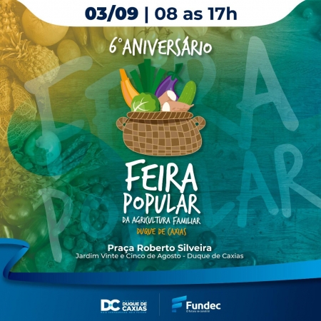 O Departamento de Segurança Alimentar e Nutricional Sustentável (DESANS), a Câmara Intersetorial de Segurança Alimentar e Nutricional (CAISAN-DC) e o Conselho Municipal de Segurança Alimentar e Nutricional (CONSEA-DC), com o apoio da FUNDEC e da Prefeitura de Duque de Caxias, convidam para a edição comemorativa do 6º aniversário da Feira Popular da Agricultura Familiar de Duque de Caxias, que acontece nesta terça-feira, 03/09, das 8h às 17h, na Praça Roberto Silveira, no Centro de Duque de Caxias. .