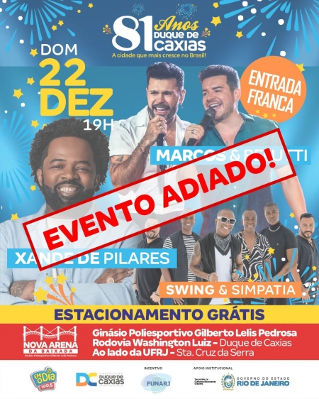 Em virtude das fortes chuvas que atingiram o município, na noite deste domingo (22/12), a Prefeitura de Duque de Caxias comunica o adiamento dos shows programados para o terceiro e último dia do Festival Caxias 81 Anos. .