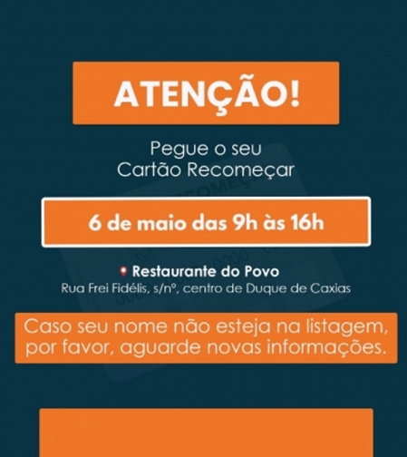 Essa chamada é apenas para as pessoas que perderam o dia de retirada. A Prefeitura de Duque de Caxias, através da Secretaria Municipal de Assistência Social e Direitos Humanos, vai realizar no dia 6 de maio, chamada para retirada do Cartão Recomeçar..