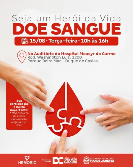 A Prefeitura de Duque de Caxias, através da Secretaria Municipal de Saúde, realizará nessa terça-feira, 15 de agosto, mais um mutirão para coleta de sangue no município. A ação é uma parceria do Hospital Municipal Dr. Moacyr Rodrigues do Carmo (HMMRC) e Hemorio..