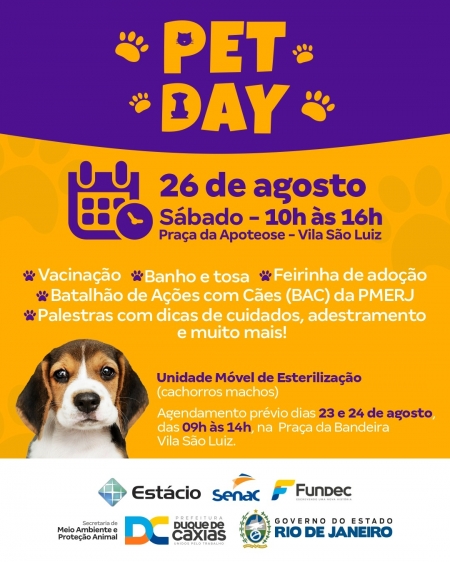 A Prefeitura de Duque de Caxias, por meio da Secretaria Municipal de Meio Ambiente e Proteção Animal, promoverá o Pet Day, em comemoração ao dia do cão, no sábado (26/08), das 10h às 16h, na Praça da Apoteose, localizada na Avenida Brasil, no bairro Vila São Luiz, com uma programação especial destinada aos animais de estimação..