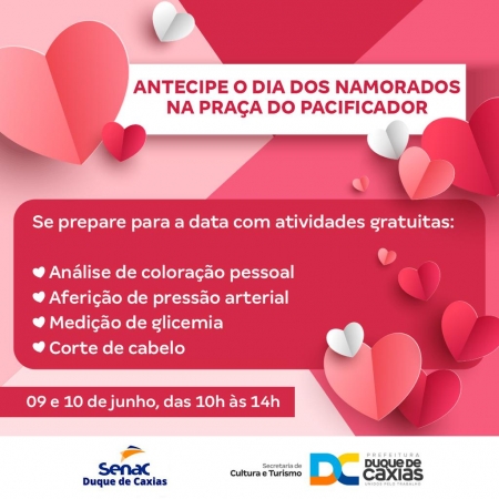 A Secretaria Municipal de Cultura e Turismo de Duque de Caxias, em parceria com o Senac, convida os apaixonados para uma ação muito especial, na Praça do Pacificador, em comemoração ao Dia dos Namorados. .