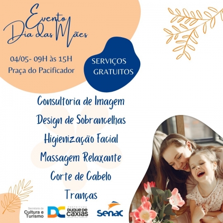 Para marcar o Dia das Mães, comemorado no próximo domingo, 08 de maio, a Secretaria Municipal de Cultura e Turismo (SMCT), em parceria com o Senac Duque de Caxias, promove nesta quarta-feira (04), na Praça do Pacificador (Centro), um evento em homenagem a todas as mamães do município..