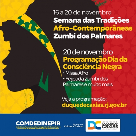 A Secretaria Municipal de Cultura e Turismo de Duque de Caxias, através do CONDEDINEPIR (Conselho Municipal de Defesa dos Direitos do Negro e Promoção da Igualdade Racial e Étnica de Duque de Caxias), promove, neste sábado, dia 20 de novembro, um ato em comemoração ao Dia da Consciência Negra. .