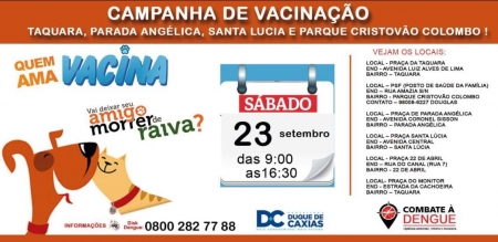 A secretaria de Saúde de Duque de Caxias, através da Coordenaria de Vigilância Ambiental e Zoonoses realiza neste sábado (23/09), no terceiro distrito, mais uma etapa da campanha de vacinação contra raiva animal com a instalação de seis postos nos bairros Parada Angélica, Taquara, Santa Lúcia e Parque Cristóvão Colombo. .