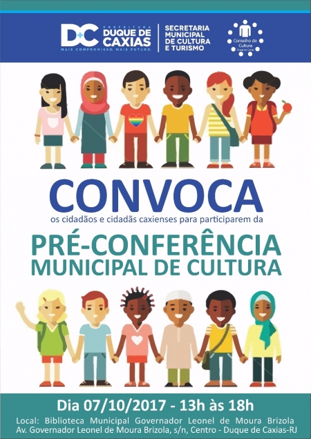 A Prefeitura de Duque de Caxias, através da Secretaria Municipal de Cultura e Turismo, convoca a todos os representantes de instituições culturais, agentes, produtores, artistas e cidadãos interessados pelo tema no município, para a Pré-Conferência Municipal de Cultura..