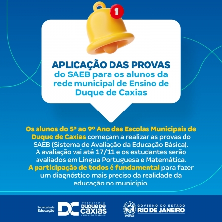 Os alunos do 5º ao 9º Ano de Escolaridade das Escolas Municipais da Rede de Ensino de Duque de Caxias começam hoje, segunda-feira (06/11), a realizar as provas do SAEB (Sistema de Avaliação da Educação Básica). A avaliação prossegue até o dia 17/11 e os estudantes serão avaliados em Língua Portuguesa e Matemática..