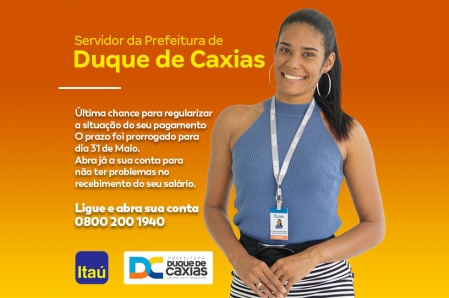 O prazo para abertura de nova conta no Banco Itaú foi prorrogado para os servidores públicos do município de Duque de Caxias. Os funcionários terão até o dia 31/05 (segunda-feira) para realizar a mudança para não terem problemas no pagamento da folha salarial do mês de maio. .