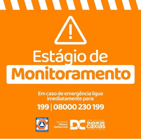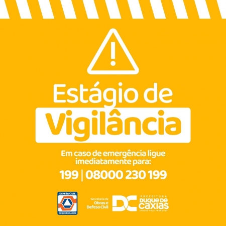 A Secretaria de Obras e Defesa Civil de Duque de Caxias informa que, por causa da previsão de chuvas nas próximas horas, o município entrou em estágio de Vigilância. A Defesa Civil pede aos moradores das regiões consideradas de risco, atingidas pelas chuvas, para, ao notarem qualquer anormalidade, procurarem um local seguro ou os pontos de apoio, localizados em igrejas, associações de moradores e escolas de cada distrito, e que liguem imediatamente para os telefones 199 e 08000230199 ou para o Corpo de Bombeiros, no número 193..