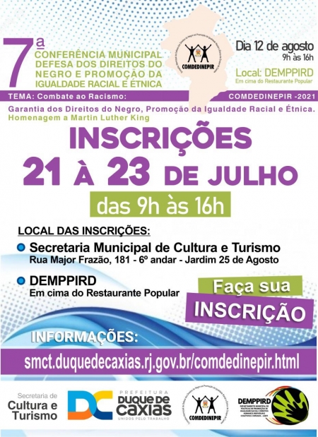 A Secretaria Municipal de Cultura e Turismo de Duque de Caxias abre nesta quarta-feira (21), das 9h às 16h, inscrições gratuitas para a 7ª Conferência Municipal de Defesa dos Direitos do Negro e Promoção da Igualdade Racial e Étnica. Neste ano, o tema é o “Combate ao Racismo: Garantia dos direitos do negro, promoção da igualdade racial e étnica”, uma homenagem a Martin Luther King..