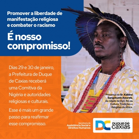 A Secretaria Municipal de Assistência Social e Direitos Humanos de Duque de Caxias, através da Coordenadoria de Políticas de Promoção de Igualdade Racial e Direitos Individuais Coletivos e Difusos LGBT (COMPPIRD), receberá nos dias 29 e 30/01 uma comitiva vinda da África, na sede da SMASDH. O evento tem o objetivo de reafirmar ações positivas e ampliar parcerias voltadas a garantia de direitos humanos para população negra e cultura diáspora..