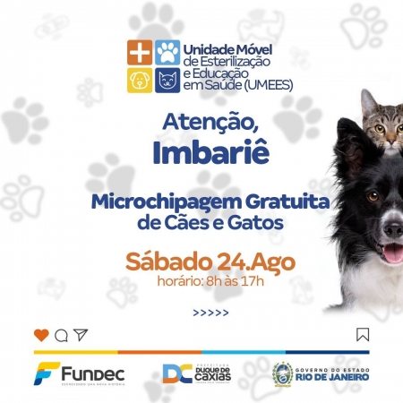 Neste sábado (24/08), a Prefeitura de Duque de Caxias, através da FUNDEC, realizará mais uma campanha de implantação de microchips em cães e gatos, no bairro de Imbariê. Além da ação de microchipagem, a Unidade Móvel de Esterilização e Educação em Saúde (UMEES) estará presente para início de agendamento prévio para castração. A campanha acontecerá na Rua Feliciano Sodré S/N – Imbariê (próximo à Barbearia Isac PQD). .