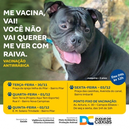 A Prefeitura de Duque de Caxias segue com a Campanha de Vacinação Antirrábica para cães e gatos no município. Entre os dias 30/11 e 03/12, as equipes de vacinação estarão nos bairros Pilar, Nova Campinas e Imbariê..