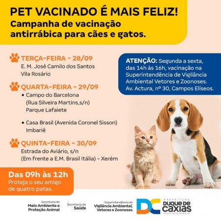 A Prefeitura de Duque de Caxias segue com a Campanha de Vacinação Antirrábica para cães e gatos no município. Nos dias 28,29 e 30 de setembro serão contemplados os bairros Vila Rosário, Parque Lafaiete, Imbariê e Xerém..