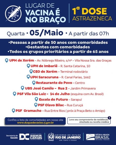 A Prefeitura de Duque de Caxias continua com o calendário de vacinação, nesta quarta-feira (05/05), da primeira dose de Astrazeneca para pessoas com 50 anos ou mais e Gestantes, portadores de comorbidades, além de todos os grupos prioritários a partir de 65 anos, incluídos no Plano Nacional de Imunização (PNI). .