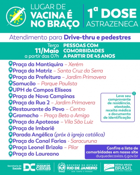 A vacinação com a primeira dose de Astrazeneca segue neste sábado (08/05), em Duque de Caxias, para pessoas com Comorbidades (acima de 50 anos). O grupo está incluído como prioritário no Plano Nacional de Imunização (PNI). A Prefeitura de Duque de Caxias reforça que todos deverão apresentar atestado ou receita médica que comprove a comorbidade, documento de identificação e comprovante de residência. Confira ao final do texto a lista de comorbidades que podem vacinar. .