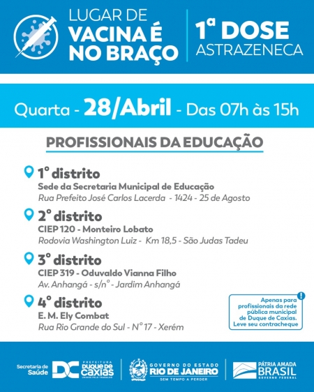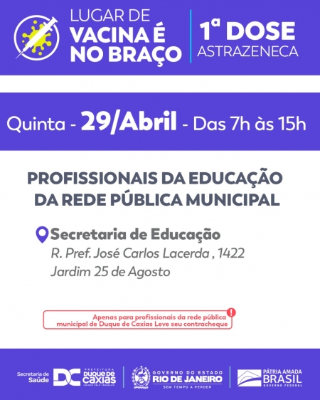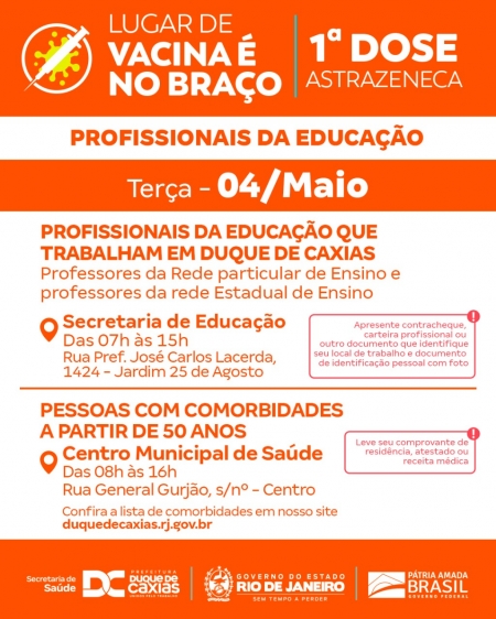 A Prefeitura de Duque de Caxias segue, nesta terça-feira (04/05), com a vacinação da primeira dose de Astrazeneca para os profissionais de educação da rede pública Estadual e da rede privada do município (na sede da Secretaria Municipal de Educação) e para pessoas com comorbidades, com 50 anos ou mais (no Centro Municipal de Saúde). Os dois grupos estão incluídos como prioritários no Plano Nacional de Imunização (PNI). .