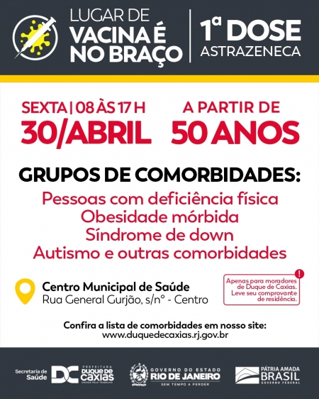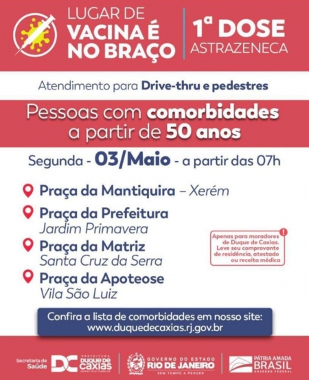 A Prefeitura de Duque de Caxias segue com a vacinação contra a Covid-19 no município, nesta segunda-feira, 03/05. Estão sendo disponibilizados pontos de vacinação para aplicação da primeira dose da vacina Astrazeneca, para pessoas com comorbidades (a partir de 50 anos), profissionais de educação da rede estadual, privada e de instituições de ensino instaladas no município de Duque de Caxias. Todos os grupos estão incluídos como prioritários pelo Plano Nacional de Imunização (PNI): .