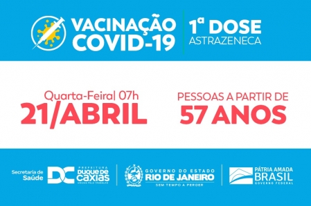 A Prefeitura de Duque de Caxias amplia nesta quarta-feira (21/04) o alcance da imunização contra a Covid-19 no município, com a aplicação da primeira dose da vacina Astrazeneca para pessoas de 57 anos ou mais. A vacinação acontece, a partir das 7 horas, na Praça do Pacificador (Centro) e na Praça da Apoteose, na Vila São Luiz..