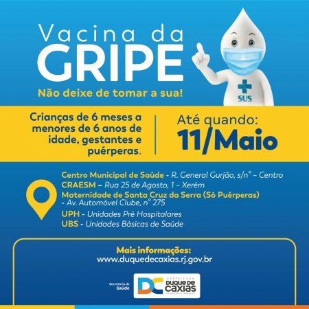 A partir desta segunda-feira (19/04) o município de Duque de Caxias começa a vacinação contra a Gripe Influenza para os grupos prioritários, segundo determinação do Ministério da Saúde. As vacinas chegaram ao município na quarta-feira (14) e foram distribuídas às unidades para a imunização dos trabalhadores da saúde que atuam na urgência e emergência dos hospitais. A primeira etapa da vacinação na cidade irá até o dia 11/05, contemplando crianças de 6 meses a menores de 6 anos de idade, gestantes e puérperas (Mulheres que tiveram bebê nos últimos 45 dias)..