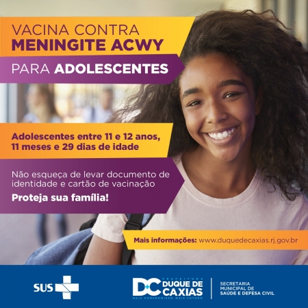 A Prefeitura de Duque de Caxias, através da Secretaria Municipal de Saúde e Defesa Civil, informa que já está disponível na rede municipal a vacina Meningo ACWY que protege contra meningite e infecções generalizadas causadas pela bactéria meningococo dos tipos A, C, W e Y. A imunização é destinada aos adolescentes entre 11 e 12 anos (12 anos, 11 meses e 29 dias) e foi incorporada ao esquema de vacinação do Sistema Único de Saúde (SUS) no dia 23 de abril deste ano. .