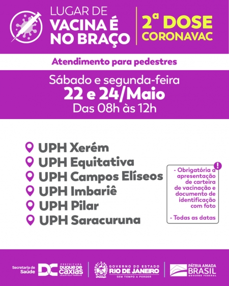 A Prefeitura de Duque de Caxias segue com a aplicação da segunda dose da vacina Coronavac, neste sábado (22) e na segunda-feira (24), para todos que ainda não completaram a imunização. A aplicação da segunda dose acontece, das 8h às 12h, nas Unidades Pré-Hospitalares (UPH) do município, com a apresentação do cartão de vacinação e documento de identificação. .
