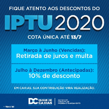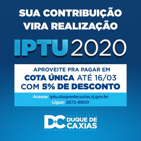 Até o dia 16 de março, a Prefeitura de Duque de Caxias, através da Secretaria Municipal de Fazenda e Planejamento, está disponibilizando para os contribuintes do município descontos de 5% no pagamento do IPTU (Imposto sobre a Propriedade Predial e Territorial Urbana), referente ao ano de 2020. Para ter direito ao desconto o contribuinte deve efetuar o pagamento do imposto em cota única, até 16/03. .