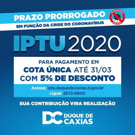 A Prefeitura de Duque de Caxias, através da Secretaria Municipal de Fazenda e Planejamento, decidiu prorrogar o prazo de pagamento do IPTU em cota única. Agora, o contribuinte pode efetuar o pagamento do imposto com desconto de 5% até o dia 31/03. .