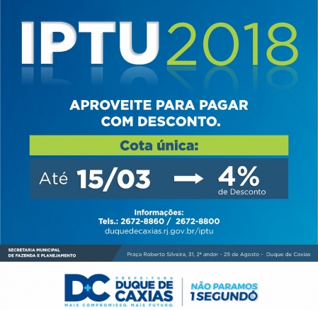 A Prefeitura de Duque de Caxias, através da Secretaria Municipal de Fazenda e Planejamento, está disponibilizando descontos para os contribuintes no pagamento do IPTU - Imposto sobre a Propriedade Predial e Territorial Urbana, que pagarem por meio de cota única. .