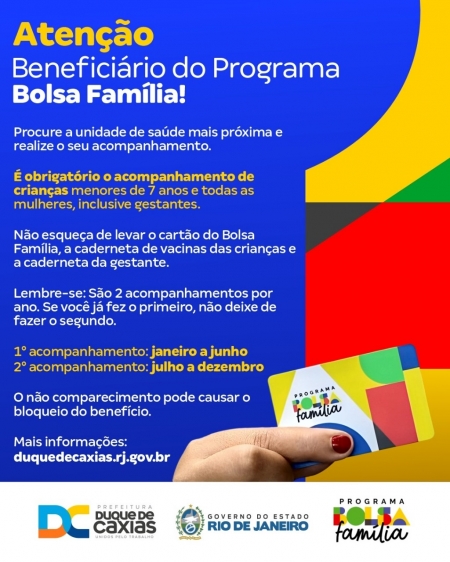 A Prefeitura de Duque de Caxias, através das Secretarias Municipais de Saúde (SMS) e de Assistência Social e Direitos Humanos (SMASDH), convoca os beneficiários do Programa Bolsa Família no município para o acompanhamento obrigatório para crianças menores de sete anos e todas as mulheres, inclusive gestantes. A SMASDH alerta aos beneficiários que o não comparecimento pode causar o bloqueio do benefício..
