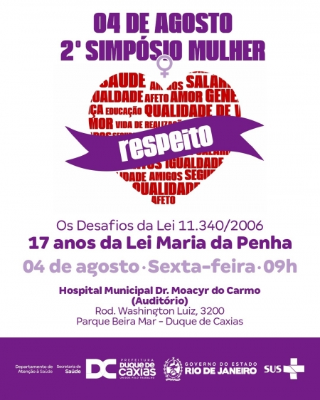 A Prefeitura de Duque de Caxias, através da Secretaria Municipal de Saúde, promove, na próxima sexta-feira (04/08), mais uma edição do Simpósio Mulher, no auditório do Hospital Municipal Dr. Moacyr Rodrigues do Carmo (HMMRC). O simpósio, com início às 9h, terá como tema: “Os desafios da Lei 11.340/2006 – 17 anos da Lei Maria da Penha”. O evento é aberto ao público..