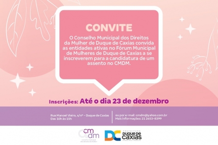 O Conselho Municipal dos Direitos da Mulher de Duque de Caxias (CMDM) abriu as inscrições para que as entidades ativas no Fórum Municipal de Mulheres de Duque de Caxias possam concorrer a um assento no Conselho Municipal dos Direitos da Mulher de Duque de Caxias. A ação foi validada por meio do edital nº 001/2022 de Convocação, publicado em Diário Oficial nº 7211 de 04 de novembro de 2022, as fls. 6 e 7. .