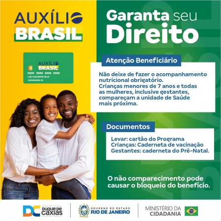 A Prefeitura de Duque de Caxias, através das secretarias municipais de Saúde e de Assistência Social e Direitos Humanos (SMASDH), convoca os beneficiários do Programa Auxílio Brasil no município para o acompanhamento nutricional obrigatório para todas as crianças menores de sete anos e todas as mulheres, inclusive gestantes. O não comparecimento pode causar o bloqueio do benefício..