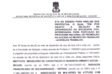 A SECRETARIA MUNICIPAL DE ASSISTÊNCIA SOCIAL E DIREITOS HUMANOS DE DUQUE DE CAXIAS – RJ, com esteio na Lei no 13.019, de 31 de julho de 2014, Deliberação 277/2017 do Tribunal de Contas do Estado do Rio de Janeiro – TCE-RJ, torna público o resultado preliminar do chamamento público n.º 001/2021, tendo sido desclassificadas as instituições que apresentaram propostas: 1) Instituto Brasileiro de Capacitação e Desenvolvimento Social - IBCADS, inscrita no CNPJ sob o nº 08.729.512/0001-03, SERVIÇOS FRANCISCANO DE SOLIDARIEDADE – SEFRAS, inscrita no CNPJ nº 11.861.086/0001-63 e 2 Associação de Mulheres de Atitude com Compromisso Social – AMAC inscrita no CNPJ sob o nº 24.119.219/0001-72. Anexo: Ata de resultado preliminar.