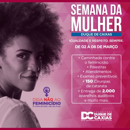 A Prefeitura de Duque de Caxias preparou uma programação especial para celebrar o Dia Internacional da Mulher, comemorado em 08/03. Durante a semana, de 2 a 8, a mulher será o tema principal das diversas atividades promovidas no município. .