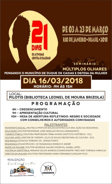 A Prefeitura de Duque de Caxias, através da Secretaria Municipal de Cultura e Turismo, convida a todos para o seminário “Múltiplos Olhares – Pensando o Município de Duque de Caxias e Defesa da Mulher”, promovido pelo Conselho de Defesa dos Direitos do Negro e Promoção da Igualdade Racial e Étnica de Duque de Caxias ( COMDEDINEPIR) , no dia 16 de março, das 9h às 15h, no andar térreo da Biblioteca Municipal Governador Leonel de Moura Brizola. .