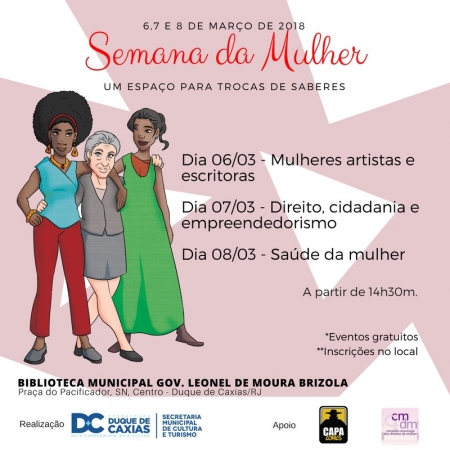 A Prefeitura Municipal de Duque de Caxias, através da Secretaria de Cultura e Turismo, promove entre os dias 6 e 8 de março, na Biblioteca Municipal Governador Leonel de Moura Brizola (Praça do Pacificador – Centro), a Semana da Mulher, com mesas de debates sobre os direitos da mulher. Os debates contarão com a participação de artistas, acadêmicas, ativistas e conselheiras do Conselho Municipal dos Direitos da Mulher. O objetivo dos encontros é a troca de informações e o debate sobre as questões pertinentes à mulher. .