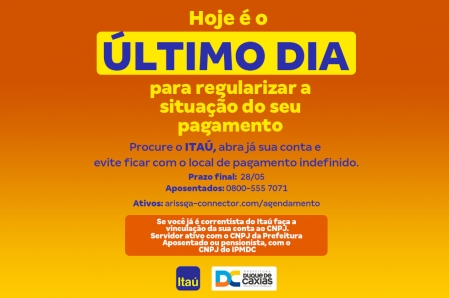 O Banco Itaú é o novo gestor da folha de pagamento dos servidores públicos municipais de Duque de Caxias. Por isso, os servidores ativos, aposentados e pensionistas da Prefeitura precisam abrir uma nova conta. Isso pode ser feito pelo celular ou por agendamento com atendimento presencial em qualquer agência do banco Itaú. .
