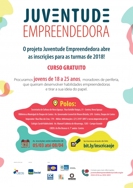 O projeto Juventude Empreendedora está com as inscrições abertas, até o dia 08 de abril, para as turmas de 2018, contemplando jovens de 18 a 25 anos, moradores de periferia, que queiram desenvolver as habilidades empreendedoras. .