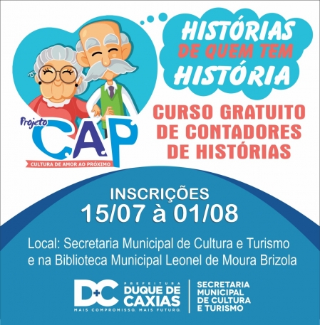 A Secretaria Municipal de Cultura e Turismo de Duque de Caxias lança o projeto CAP – Cultura de Amor ao Próximo, que visa capacitar os participantes a desenvolverem atividades interativas com crianças, jovens e adultos, tendo como recurso a Contação de Histórias. Os interessados devem ser maiores de 60 anos e residirem no município de Duque de Caxias. .