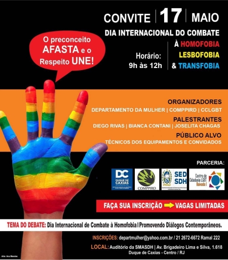 A Prefeitura de Duque de Caxias, através da Secretaria Municipal de Assistência Social e Direitos Humanos, promove no dia (17/05), das 9h às 12h, o Dia Internacional do Combate à Homofobia, Lesbofobia e Transfobia. O evento vai acontecer no auditório da SMASDH. .
