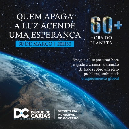 A Prefeitura de Duque de Caxias, através da Secretaria Municipal de Governo, participa pelo terceiro ano consecutivo, do movimento mundial “A Hora do Planeta”, que acontece neste sábado, dia 30 de março, das 20h30 as 21h30. Durante 60 minutos milhares de cidades espalhadas por mais de 170 países, promovem ações que têm como principal objetivo a conscientização mundial acerca das mudanças climáticas e a reflexão sobre a adoção de medidas de economia das energias renováveis. .