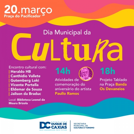 A Prefeitura de Duque de Caxias, através da Secretaria Municipal de Cultura e Turismo, comemora neste quarta-feira, dia 20 de março, o Dia Municipal de Cultura, com atividades gratuitas no município. .