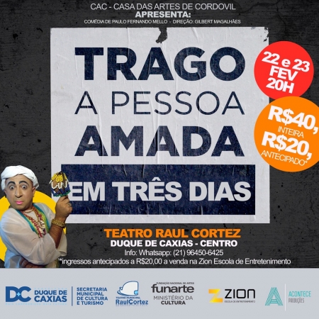 TEATRO RAUL CORTEZ APRESENTA A COMÉDIA “TRAGO A PESSOA AMADA EM TRÊS DIAS”