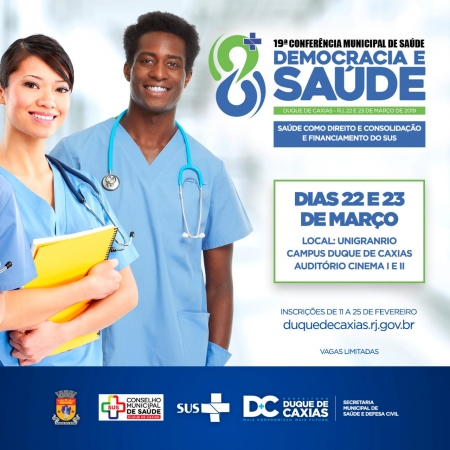 A Prefeitura de Duque de Caxias, por meio do Conselho Municipal de Saúde e da Secretaria Municipal de Saúde, realizará nos dias 22 e 23 de março de 2019, a 19ª Conferência Municipal de Saúde, que terá como tema central: “Democracia e Saúde: Saúde como Direito e Consolidação e Financiamento do SUS”. O encontro acontece na Unigranrio Duque de Caxias – Auditórios do Cinema I e II, localizado a Rua Prof. José de Souza Herdy, 1.160 - Jardim 25 de Agosto – DC. .