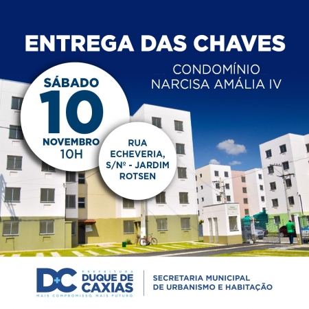 A Prefeitura de Duque de Caxias, através da Secretaria Municipal de Urbanismo e Habitação, irá promover neste próximo sábado, (10/11) a entrega das chaves para os novos moradores do Condomínio Narcisa Amália IV, no bairro Jardim Rotzen. .