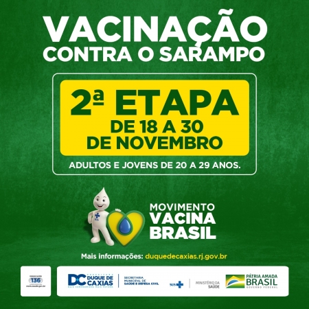 A Prefeitura de Duque de Caxias, através da Secretaria Municipal de Saúde e Defesa Civil, dá início à segunda etapa da campanha de vacinação contra o sarampo nas unidades de saúde dos quatro distritos. Nesta segunda etapa, que vai de 18 a 30 de novembro, o público-alvo são adultos e jovens de 20 a 29 anos. .