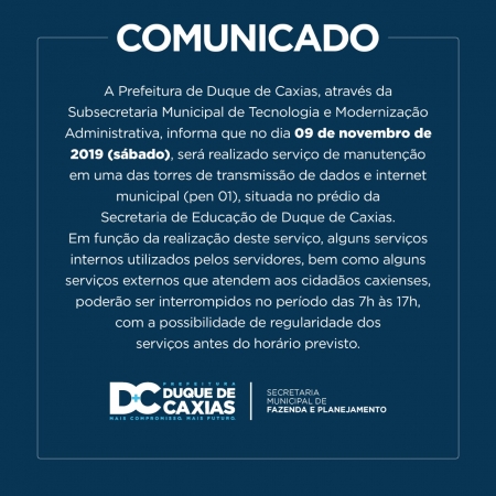 A Prefeitura de Duque de Caxias, através da Subsecretaria Municipal de Tecnologia e Modernização Administrativa, informa que no dia 09 de novembro de 2019 (sábado), será realizado serviço de manutenção em uma das torres de transmissão de dados e internet municipal (pen 01), situada no prédio da Secretaria de Educação de Duque de Caxias. .