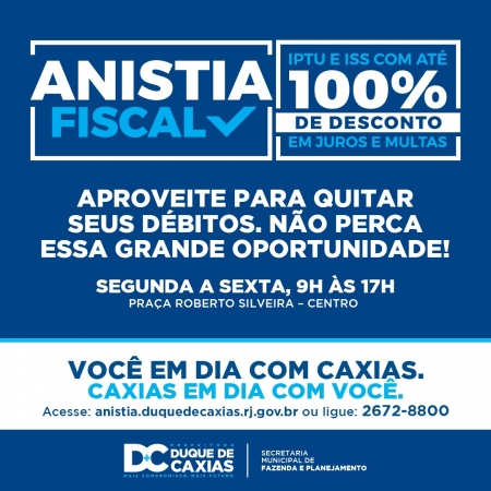 A Prefeitura de Duque de Caxias, através da Secretaria Municipal de Fazenda e Planejamento, prorrogou até 20 de dezembro de 2019, o prazo para a quitação das dívidas dos contribuintes junto a Prefeitura. As novas regras para a Anistia Fiscal, autorizadas através da Lei Municipal nº 2.899/2018, já estão em vigor para facilitar a negociação dos contribuintes do município. .